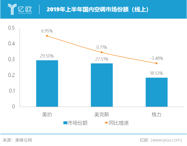 奥维云网(AVC)的统计数据显示,经过一番发力,截至2019年6月末,美的空调在线上渠道的市场份额已经冲到第1位,线上份额为29.5%,奥克斯空调紧随其后,拿到27.51%的市场份额。
